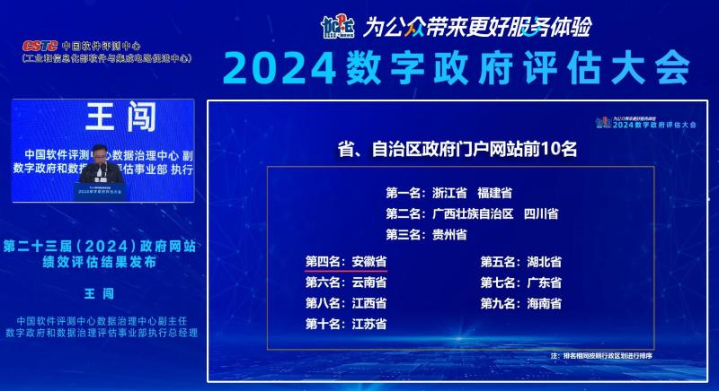 在省、自治區(qū)政府門戶網(wǎng)站評估結(jié)果中,安徽省再次躋身全國前十,位列第4名。