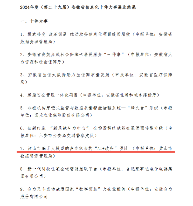 7月31日,安徽省信息化協(xié)會(huì)正式公布 2024 年度(第二十九屆)安徽省信息化十件大事遴選結(jié)果。由龍訊提供技術(shù)支持的黃山市基于大模型的多專家架構(gòu) “AI + 政務(wù)” 項(xiàng)目,歷經(jīng)多輪嚴(yán)格專家評審,在全省眾多申報(bào)項(xiàng)目中脫穎而出,成功入選2024年度(第二十九屆)安徽省信息化十件大事。這一成果不僅是對黃山市信息化建設(shè)的肯定,更彰顯了人工智能技術(shù)在政務(wù)服務(wù)領(lǐng)域的深度應(yīng)用價(jià)值。