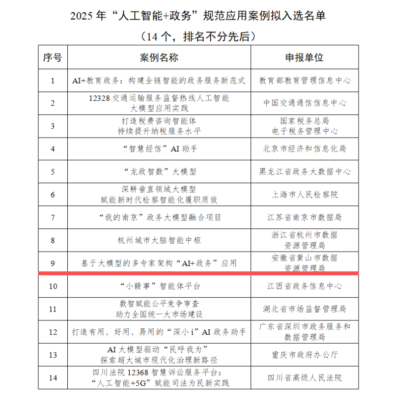 日前,中央網(wǎng)信辦信息化發(fā)展局指導(dǎo)、中國(guó)網(wǎng)絡(luò)社會(huì)組織聯(lián)合會(huì)組織評(píng)選2025年“人工智能+政務(wù)”規(guī)范應(yīng)用案例,黃山市“基于大模型的多專(zhuān)家架構(gòu)‘AI+政務(wù)’項(xiàng)目”成功入選,是我省唯一入選的“人工智能+政務(wù)”項(xiàng)目。2025年9月,黃山市“AI+政務(wù)”項(xiàng)目獲評(píng)2025世界制造業(yè)大會(huì)“安徽省信息化十件大事”。本次入選中央網(wǎng)信辦“人工智能+政務(wù)”規(guī)范應(yīng)用案例,標(biāo)志著黃山市“AI+政務(wù)”項(xiàng)目,已成為引領(lǐng)全國(guó)“人工智能+政務(wù)”項(xiàng)目的標(biāo)桿之一。